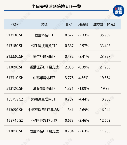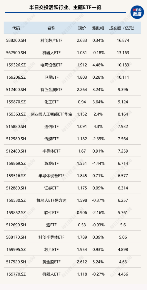 节后首个交易日,今日上午科创芯片ETF(588200)、机器人ETF(562500)成交金额超过13亿元,电网设备ETF(159326)、卫星ETF(159206)半日成交金额超10亿元;跨境ETF方面,恒生科技ETF(513130)半日成交金额超35亿元。