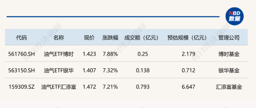ETF涨幅榜方面,油气ETF博时(561760)半日涨幅达7.88%,领涨整个行业主题ETF市场,另外两只油气相关ETF半日涨幅也在7.3%左右。
