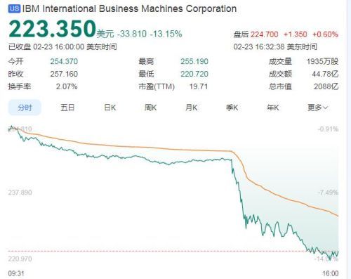 周一美股盘中,IBM股价从近4.5%的跌幅迅速扩大至两位数,成为人工智能技术飞速发展的最新“受害者”。截至收盘,IBM股价报223.35美元,跌幅13.15%。