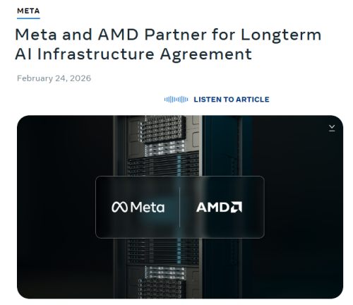 周二(2月24日)美股盘前,Meta和AMD双双在官网宣布扩大战略合作伙伴关系,Meta将部署6吉瓦AMD的Instinct GPU。