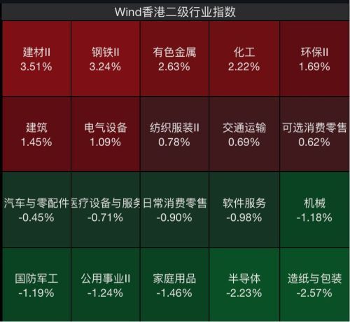 板块方面,建材、钢铁、有色、化工等周期性行业领涨。建材股中,海螺水泥(HK00914)涨超5%。钢铁股中,重庆钢铁股份(HK01053)涨超8%,鞍钢股份(HK00347)涨超5%。