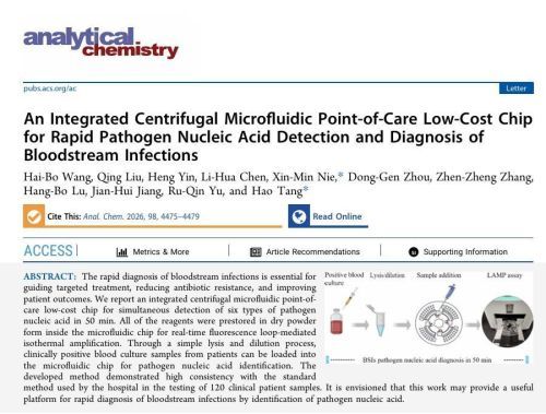 2月26日,记者从中南大学湘雅三医院获悉,该院聂新民教授团队联合湖南大学科研团队,成功研发出一款可在50分钟内精准检测6类常见血流感染致病菌的微流控芯片,成本仅需30元。这款物美价廉的芯片,有望为临床感染在诊断上抢出宝贵的“生死时速”。相关重要成果日前刊发于《分析化学》。