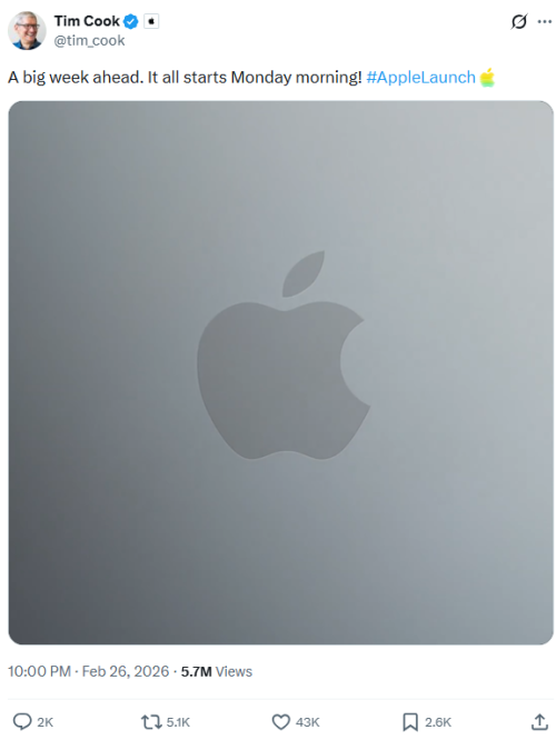 苹果首席执行官库克在X上发布了一条神秘帖子,称精彩的一周即将到来。一切都从周一早上开始。下方是一则手指塑造苹果商标的视频,推文最后还打上了“苹果发布”的标签。
