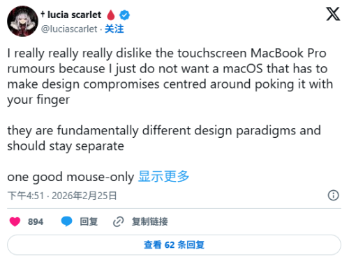 而苹果发布的视频中,一个人用手指画出苹果图表的动作似乎也在暗示触摸屏的出现。不过,从X上的网友评论来看,触摸屏并没有大受欢迎,有用户称并不想要一个为了迎合触摸屏需求而做出设计妥协的macOS系统设备。