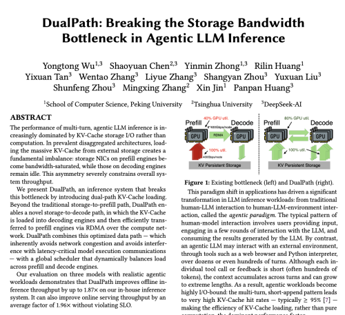 具体来说,新论文介绍了一个名为DualPath的创新推理系统,专门针对智能体工作负载下的大模型(LLM)推理性能进行优化。通过引入“双路径读取KV-Cache(类似记忆缓存)”机制,重新分配存储网络负载,将离线推理吞吐量最高提升 1.87 倍,在线服务的每秒智能体运行数平均提升 1.96 倍。