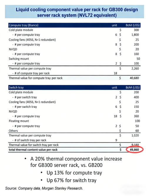 并且,更高能量密度的芯片架构,所需的液冷散热组件价值也更高。根据摩根士丹利报告,英伟达GB300 NVL72机架级AI系统的液冷散热组件价值高达49860美元,比GB200 NVL72系统高出约20%,下一代Vera Rubin NVL144平台的散热总价进一步增长17%,达到约55710美元。当联想集团的海神温水冷、飞鱼仿生散热设计等应用到这些更新的芯片架构上时,其盈利水平也将随之水涨船高。