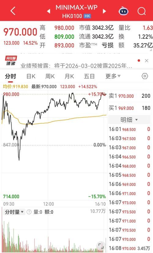 国产AI大模型板块逆势收涨,智谱大涨42.72%,MiniMax-WP涨14.52%,市值双双冲破3000亿港元。