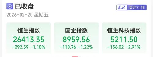 2月20日,港股迎来农历马年第一个交易日。三大指数集体下跌,截至收盘,香港恒生指数收跌1.10%,恒生科技指数收跌2.91%,国企指数收跌1.22%。