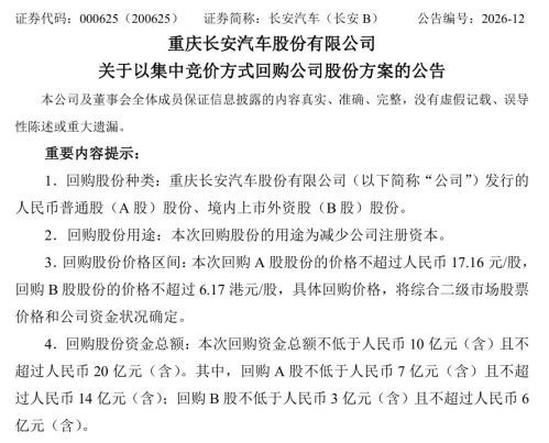 关于此次回购股份的目的和用途,长安汽车表示,是结合当前财务状况及经营规划,拟使用自有资金进行A、B股股份回购,同时本次回购股份可减少公司注册资本。