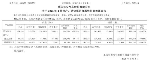 3月2日晚间,长安汽车发布最新产销数据显示,其2月销量15.19万辆,同比下降5.89%,环比上涨12.8%。其中,新能源汽车销量4.22万辆,同比增长6.42%;海外市场销量6.49万辆。
