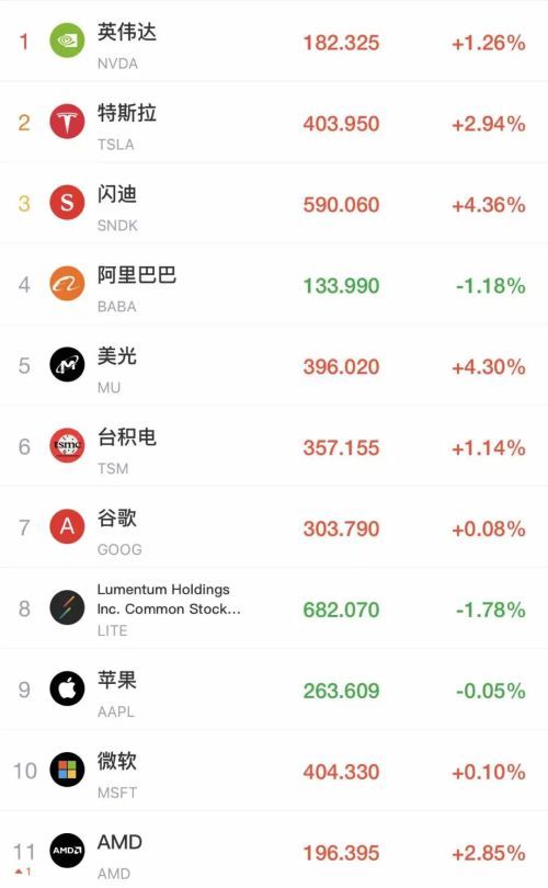 科技股普遍反弹走高,美光科技、闪迪涨超4%,特斯拉、亚马逊涨近3%,英伟达涨超1%。
