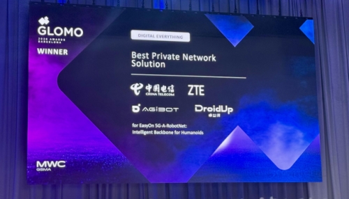 由智元机器人携手中国移动、中兴通讯、卓益得机器人联合打造的EasyOn 5G-A-RobotNet解决方案,从全球顶尖参评项目中脱颖而出,成功摘得享有“通信界奥斯卡”之称的全球移动大奖(GLOMO)“最佳专用网络解决方案奖”。