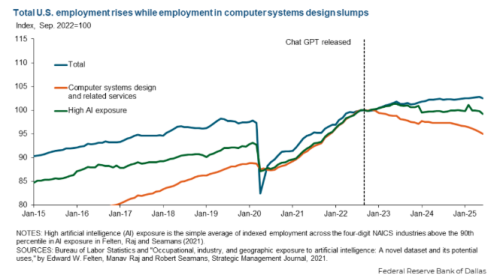 其他研究也指向了相同的方向。摩根士丹利1月份对美国公司的一项调查显示,在最常采用AI的行业中,公司更有可能雇佣或转岗培训员工,而不是裁撤或不填补职位。达拉斯联储上周的一篇论文也发现,至少到目前为止,AI既在辅助工人,也在取代工人。