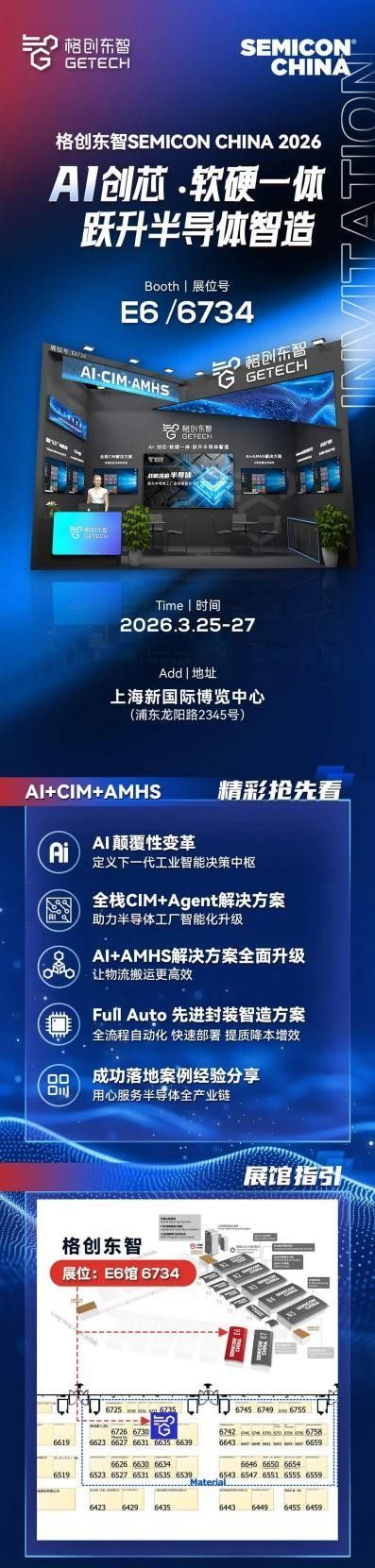 作为聚焦半导体领域的AI驱动的工业智能解决方案领军企业,格创东智将携“AI+CIM+AMHS”三大核心引擎重磅亮相,全景展示下一代工业智能决策中枢、全栈CIM+Agent解决方案、AI+AMHS自动化物料搬运系统、Full Auto先进封装智造方案的最新技术突破与落地成果。