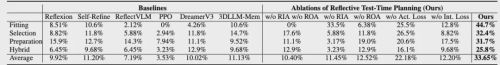 例如,移除行动中反思后,准备任务成功率从 31.7% 骤降至 3.17%。原因在于缺少高质量候选动作,后续的行动后反思无法获得有效学习样本,只能在错误动作上反复优化。而移除行动后反思,则会让行动中反思的评分过度自信、与现实脱节,模型会持续选择看似最优、实则错误的动作。