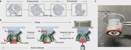 该抓手通过电化学与磁场协同调控,实现了从皮克级到百克级物体的超柔顺抓取与主动释放,在微纳尺度物体操控中释放加速度高达42G,刷新了机器人释放速度的世界纪录,操作接触压力低至10 Pa,是现有报道中的最低水平,为机器人微操控提供了全新范式。
