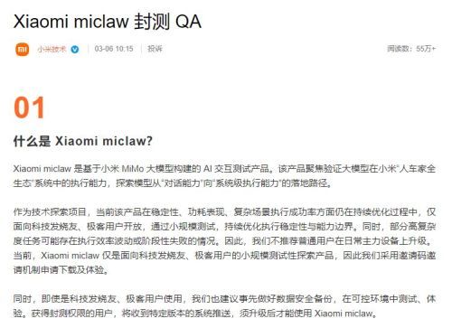 “小米技术”公众号3月6日同步发布了《Xiaomi miclaw封测QA》。这份QA(问答)中,小米介绍,Xiaomi miclaw与OpenClaw的产品理念同源。在产品使用上,Xiaomi miclaw可快速部署到手机端,并能够非常方便地调用小米生态设备及系统应用,让非专业人群也可快速部署、使用,并感受移动端Agent带来的强大能力。