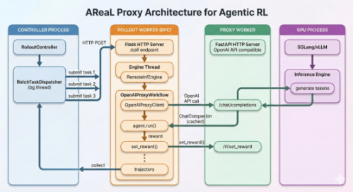 AReaL 是首个全异步训推解耦的大模型强化学习训练系统,能让 Agent 在真实任务交互中获得反馈、持续优化决策。此次发布的 v1.0版本让任意 Agent 零改造接入 RL 训练成为现实——通过在智能体与训练系统之间加入 Proxy Worker 中转层,开发者只需修改一个请求地址即可接入训练。