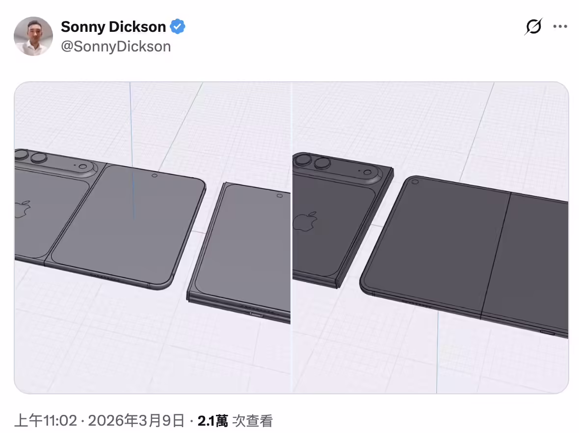 消息人士 Sonny Dickson 昨日在 X 平台发文,曝光苹果首款大折叠手机 iPhone Fold 的 3D CAD 渲染图片。