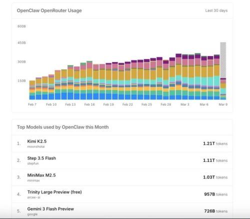 根据OpenRouter,OpenClaw 本月使用的主要模型中,前三名已经由中国大模型公司包揽,分别为Kimi K2.5、Step 3.5 Flash、MiniMax M2.5,他们分别来自月之暗面、阶跃星辰、Minimax。