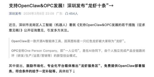 3月8日,据深圳发布,近日,深圳市龙岗区人工智能(机器人)署就《支持OpenClaw & OPC发展的若干措施(征求意见稿)》公开征询意见。OPC全称One Person Company,即“一人公司”,是在AI协同下,由个人独立完成产品全链路闭环(研发/生产/运营/营销等)的新型创业模式。