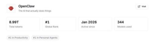 全球最大的大模型API聚合平台OpenRouter显示,在App和Agents流行度排名中,位列全球第一的OpenClaw,截至目前累计Token消耗量已经达到惊人的8.99T。