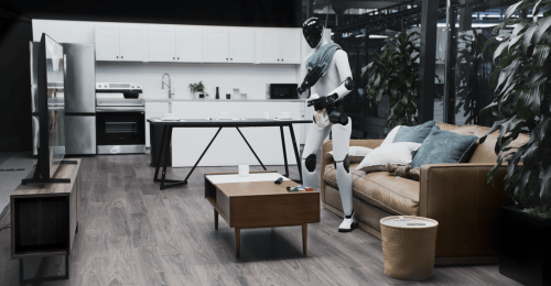 在最新演示中,它能灵活地将收纳容器夹在臂下,从而腾出一只手去捡拾散乱的物品;它能拿起遥控器精准按下操控按钮,并在放下之后将其摆正;它能一边侧身穿过咖啡桌与沙发之间的窄缝,一边继续手中的清洁工作;它甚至会把毛巾甩到肩上暂时腾手,方便操作喷雾瓶。这些动作的衔接看上去也非常顺滑。