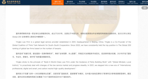 官网显示,盈科律师事务所是一家全球化法律服务机构,成立于2001年,总部位于中国北京,自2022年以来在Global 200全球律师人数排名中蝉联第一。