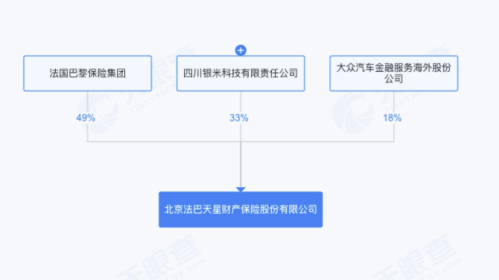 记者查阅天眼查发现,北京法巴天星财产保险股份有限公司(即法巴天星保险)成立于2025年12月16日,注册资本10亿元,由法国巴黎保险集团、四川银米科技有限责任公司、大众汽车金融服务海外股份公司共同投资成立,分别持股49%、33%、18%。