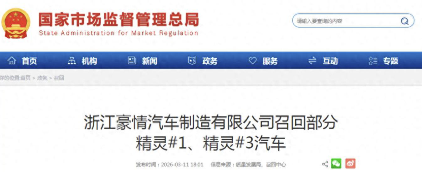 据3月11日国家市场监督管理总局官网消息,日前,浙江豪情汽车制造有限公司(简称“豪情汽车”)根据《缺陷汽车产品召回管理条例》和《缺陷汽车产品召回管理条例实施办法》的要求,向国家市场监督管理总局备案了召回计划。