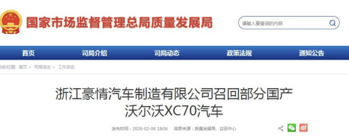 今年2月6日消息,豪情汽车召回2025年5月7日至2025年12月22日期间生产的部分国产四驱XC70汽车,共计14768辆。本次召回范围内的部分车辆,由于设计及制造原因,左后半轴存在适配性偏差。极端情况下,左后半轴可能从后驱动电机中松脱,存在安全隐患。