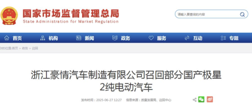 去年6月27日,豪情汽车也向国家市场监督管理总局备案了召回计划,召回2021年11月1日至2022年11月6日期间生产的部分国产极星2纯电动汽车,共计2辆。本次召回范围内部分车辆,由于制动控制模块的软件偏差,当车辆在“单踏板驾驶”驱动模式,不踩制动踏板且持续下坡滑行超过1分30秒的情况下,车辆可能失去制动功能,存在安全隐患。