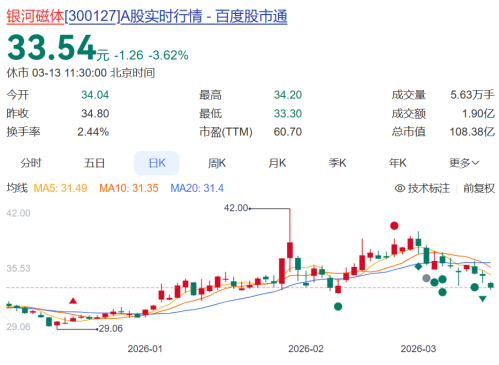 3月12日,银河磁体股价下跌,截至中午休市跌3.62%。