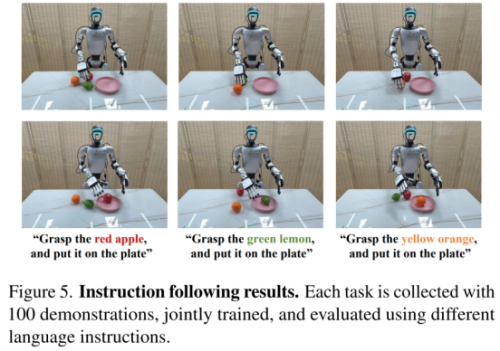 在指令跟随任务中,模型准确理解并执行各种自然语言指令,即使面对语义更抽象或表达方式变化的指令,仍能生成与意图一致的动作序列。