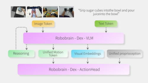 面向长时程与多步骤任务,RoboBrain-Dex引入标记驱动的“推理—执行”解耦机制:模型可在生成过程中通过特定标记(如[BOR])进入任务分解/中间推理阶段,通过(如[BOD])切换到动作生成阶段,并将相应隐表示传递给动作解码器以输出连续控制指令,从而更稳定地实现“先推理、后执行”的决策流程。