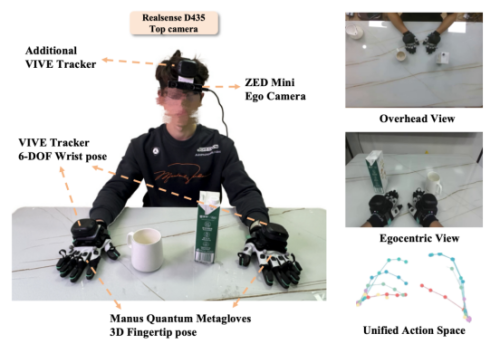 【图说】便携式glove-tracker系统:通过Manus Quantum手套精确捕获25个手部3D关键点,结合VIVE Tracker记录6自由度腕部与头部位姿,配合头戴式相机同步采集第一视角视觉信息。