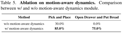 消融实验进一步验证了各模块的贡献。移除Motion Dynamics建模或采用连续动作表示都会导致性能明显下降,证实了通过RQ-VAE构建的紧凑动作token在保留关键运动信息和提升训练效率方面的关键作用。Visual Dynamics的引入则显著提升了模型在复杂视觉条件下的鲁棒性。