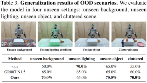 跨任务泛化实验显示,面对训练中未见过的新物体组合、不同初始状态和变化的操作环境,RoboBrain-Dex依然保持较高成功率。这种泛化能力源于多源数据预训练带来的丰富操作分布,使模型学习到更加抽象和通用的操作先验。
