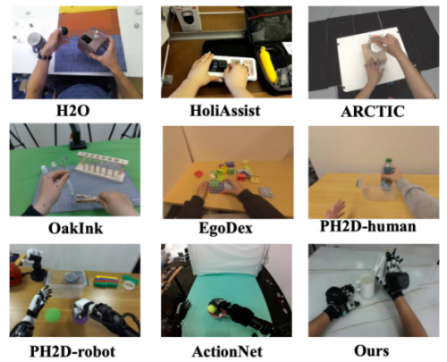 基于这套系统和开源数据的处理,智源研究院自采人类第一视角操作数据,并融合互联网开源的人类与灵巧手第一视角数据,构建了EgoAtlas数据集。为解决不同数据源的动作表示不一致问题,统一采用相机坐标系作为标准,确保了跨数据集的一致性表示。