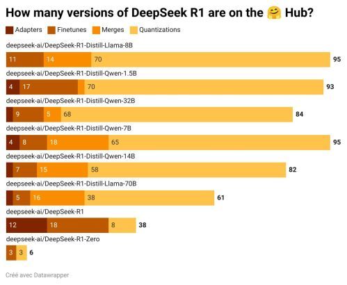 围绕DeepSeek-R1,全球开发者还展开了二次开发,并在Hugging Face推出量化版、蒸馏版、推理优化版等多种衍生版本。数据显示,DeepSeek-R1发布仅一周,社区衍生版本就突破550个,相关模型累计下载量达数百万次。