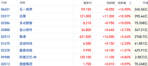 截至发稿,五一视界(06651.HK)涨近17%,迅策(03317.HK)、多点数智(02586.HK)均涨约10%左右,智谱(02513.HK)等多只个股跟涨。