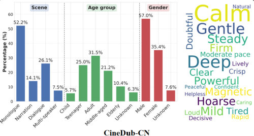CineDub 大规模数据集:利用自动化流水线构建了首个带有丰富标注的中文电视剧配音数据集,涵盖了独白、旁白、对白及多发言人等多样化场景。