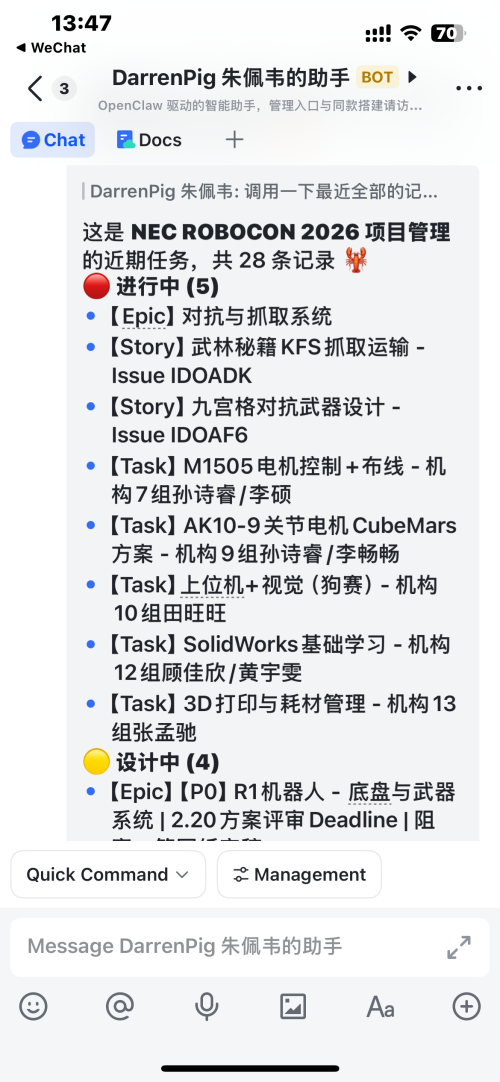 这种定位解释了为什么它看起来“很强”,却又不构成技术突破。以前工程团队需要花大量时间在流程沟通和任务协调上,现在这些工作被自动化地整理、分发、追踪。机器人执行什么动作,依然由原有控制系统决定;OpenClaw做的是把复杂的项目推进过程变得透明、可控、可追溯。它更像一个数字化 PM,而不是具身智能的大脑。
