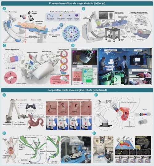 “宏观+微观”协同,宏观机器人负责导航,微型/纳米机器人深入脑血管、胆囊等狭窄区域,完成血栓取出、药物递送等精细操作,破解传统手术“够不到、做不细”的难题。例如,外部磁控机械臂引导无线的微型胶囊机器人进入胃肠道,进行定点药物释放或活检。大型机器人与微型机器人“大小搭配”,优势互补,将手术的微创化推向了极致,如图5所示。