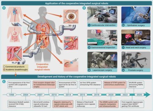图1. 协作式集成手术机器人的代表性治疗应用与发展历程