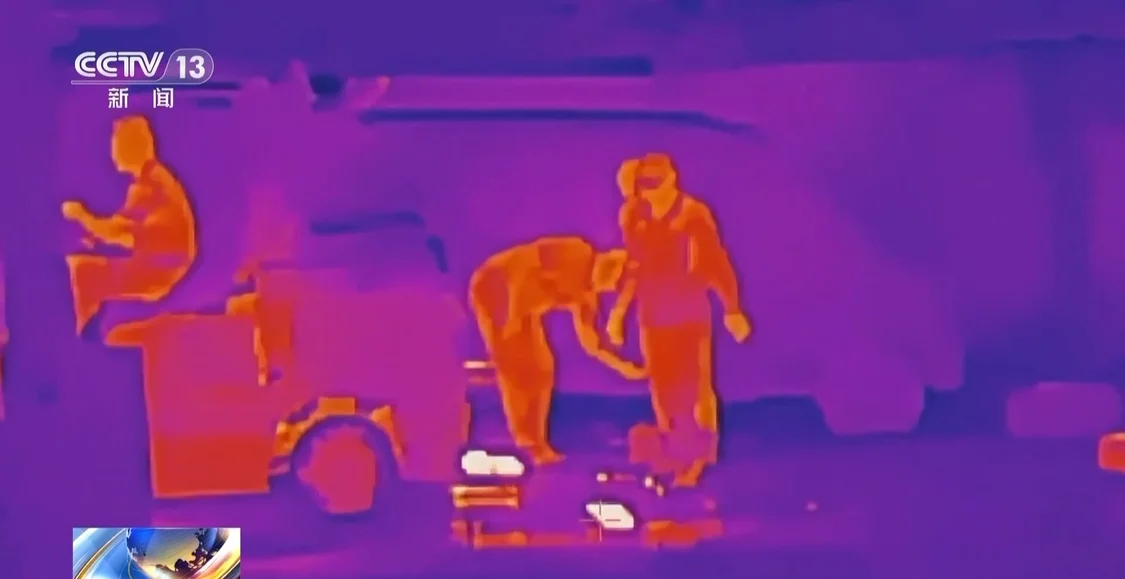 根据知情人提供的线索,记者在深夜来到了位于日照莒县。刚靠近村子,就听到里面传来机械轰鸣声,即便周围一片漆黑,也能感受到这里的热闹。为了拍摄到清晰画面,记者使用红外热成像设备,画面中温度越高的地方亮度越大,通过红外画面可以看到拆车人员正使用高温焊枪切割车底盘的零件。