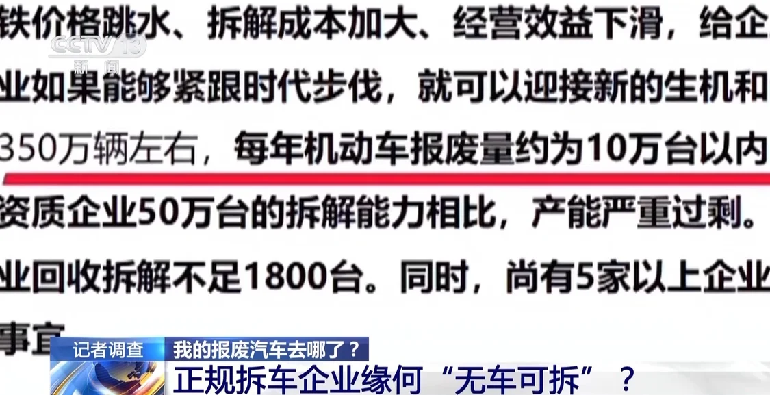 我国汽车产销量多年稳居世界首位,同时,也有大量旧车面临更新淘汰。据统计,每年有近1000万辆汽车达到报废标准。国家要求报废汽车必须交由正规拆解企业专业处理,各地也投入重金建起了标准化的拆解厂,可是,个别地区的这些拆解企业却陷入无车可拆的窘境,这到底为什么呢?