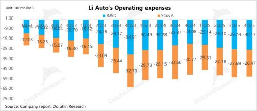 本季度理想研发费用30.2亿,环比上升0.5亿元,略高于市场预期的29.5亿元, 海豚君认为,研发投入的环比上行可能主要因为: