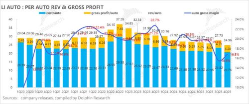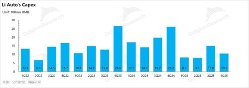 基于上述大幅下行的均价预期,以及一季度仍然相对疲软的销量(Q1销量环比25Q4下滑17%-22%,导致单车分摊的固定成本上升,规模效应减弱),再叠加近期上游锂电、存储芯片等大宗原材料涨价对BOM成本的反噬,海豚君预计理想一季度的车辆毛利率预计还要环比继续走低,低于市场预期的16.8%(25Q4水平),而具体指引仍需密切关注管理层在业绩会上的表述。