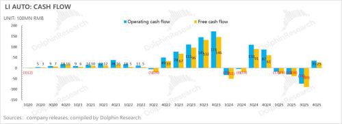 本季度经营现金流235亿,环比上行下滑110亿,同时资本开支环比收缩了4.5亿至10.5亿,最后自由现金流本季度25亿,环比上行114亿,成功转正,也带动理想的在手现金及现金等价物来到了1012亿(净现金917亿),在手现金仍然充足。